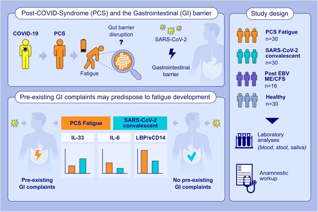 Figure: A Graphical abstract of the study that examined post-COVID fatigue syndrome and the gastrointestinal barrier. Researchers compared 30 people with post-COVID fatigue, 30 people who were convalescent after COVID-19, 16 people who had developed ME/CFS after Epstein-Barr virus and 12 healthy controls. Blood, stool and saliva were examined. Researchers found that pre-existing gastrointestinal complaints may predispose people to post-COVID fatigue.