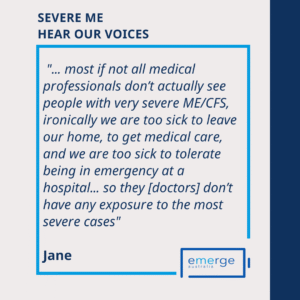 I also imagine that I would have been able to access the supports that would allow me to stay home and to have stayed moderate to severe instead of now severe to very severe, I have NDIS for a different disability (I was rejected for ME/CFS) but my funding is insufficient to be able to meet my high support needs. The only other option that has been floated outside of a hospital admission, is a care home, which as a 30 year-old, is not where I want to be, I think if I was able to get medical care early on in my illness, a lot of these options wouldn’t need to be considered. And I wouldn’t have to risk getting worse just to survive.