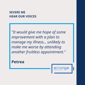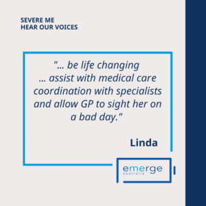 Now that I have severe ME, a bulk billing GP who came to my home would make an enormous difference to my health and my quality of life. It would ensure I could receive timely treatment for both my ME and non-ME related health issues and screenings. It would also mean I wouldn’t have to reduce my already extremely limited daily activities to prepare for, and recover from, trips to the doctor’s surgery. And if this GP had a thorough understanding of current treatments for ME, I would have hope for small, gradual improvements in my capacity and quality of life.